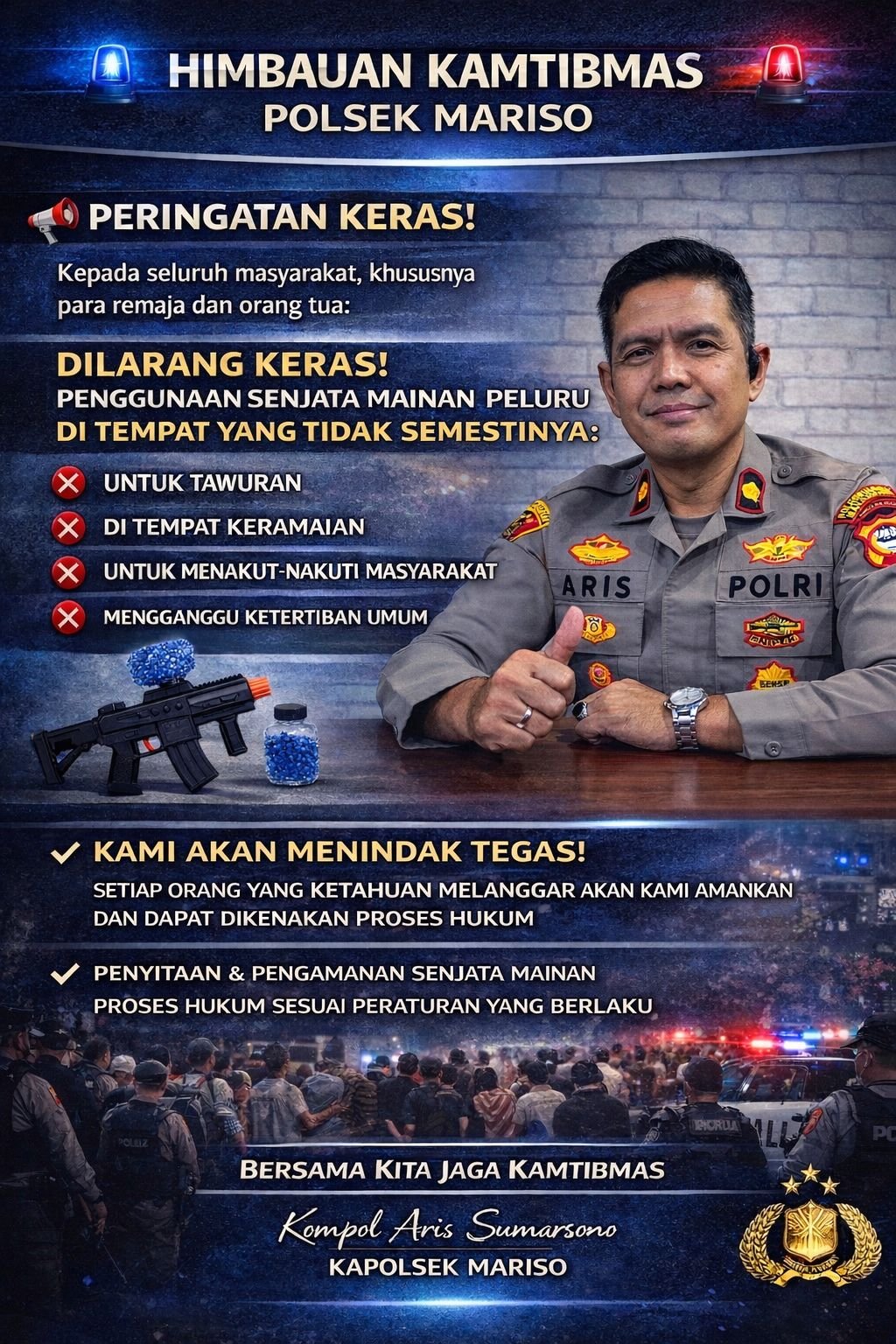 Canvas.news Makassar – Polsek Mariso mengeluarkan himbauan kamtibmas berupa peringatan keras kepada masyarakat, khususnya para remaja dan orang tua, terkait penggunaan senjata mainan berpeluru. Dalam himbauan tersebut ditegaskan bahwa senjata mainan tidak boleh digunakan di tempat yang tidak semestinya, seperti untuk tawuran, di lokasi keramaian, maupun untuk menakut-nakuti masyarakat.