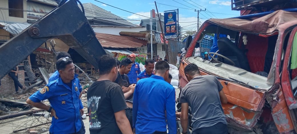 Akibatnya, kendaraan besar tersebut menabrak tiang listrik, sebuah mobil minibus yang sedang terparkir, lalu menghantam dua bangunan usaha milik warga, yakni Warkop Sandeq Rock dan Warung Makan Rejo Joyo.